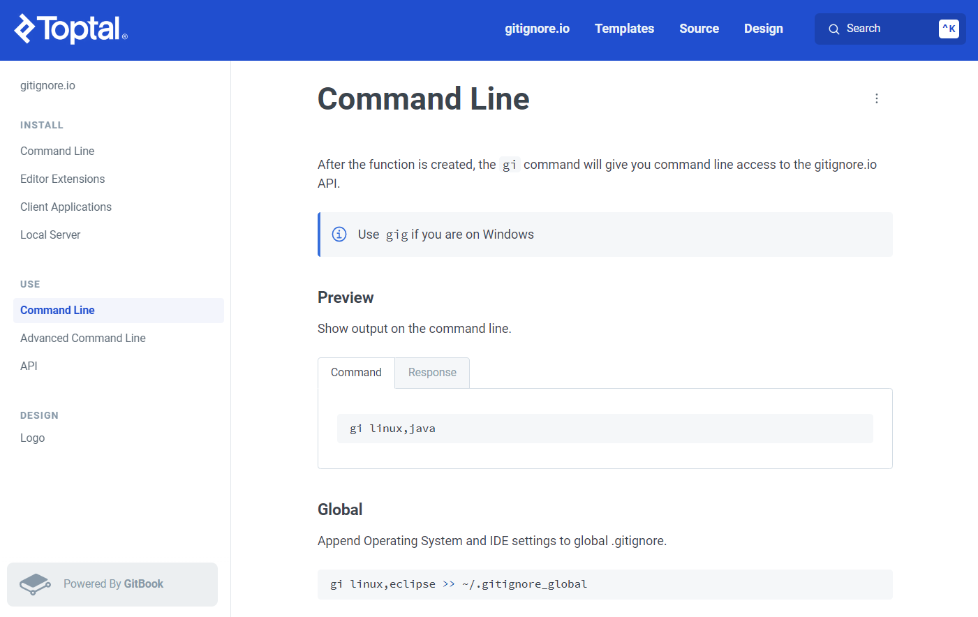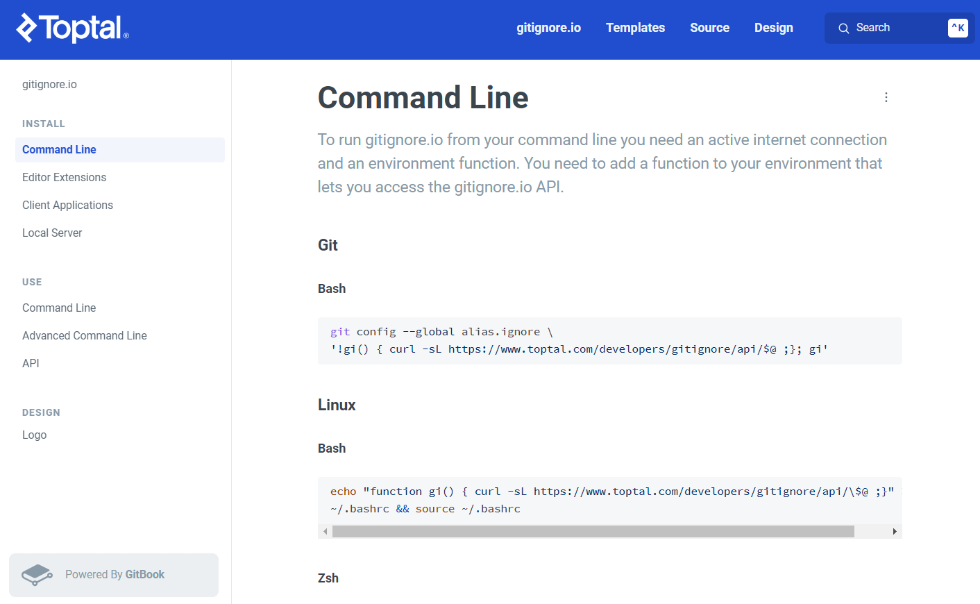 우선 명령어창에서 gitignore.io를 실행하려면 인터넷 연결이 되어있어야 하고, gitignore.io API에 액세스할 수 있도록 환경을 셋팅해줘야 한다. 환경 셋팅은 위에 나와있는 것처럼 사용하는 명령 프로그램에 해당하는 코드를 복붙해주면 된다.