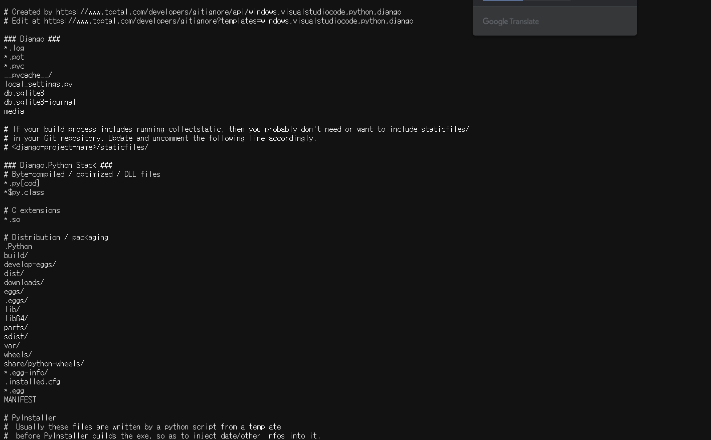 사이트에 접속하면 위와 같은 화면이 뜬다. "운영체재, 개발환경(IDE), 프로그래밍 언어"를 적고 생성 버튼을 누르면 사이트에서 .gitignore 파일을 자동으로 생성해준다.
