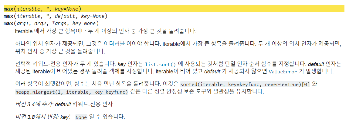 https://docs.python.org/ko/3/library/functions.html#max